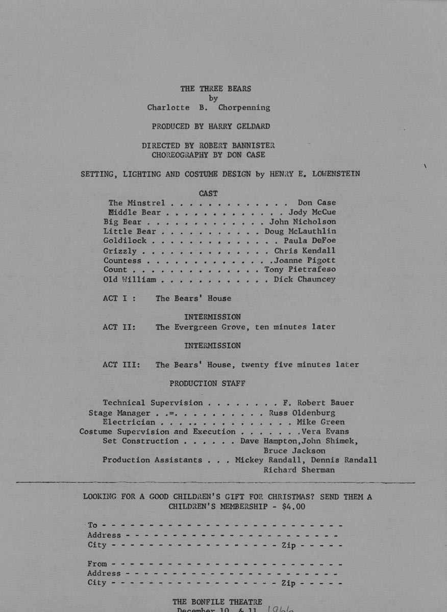 | 60-61 | Mon, Nov 28, 1960 | The Three Bears | Judith Kase Davenport |