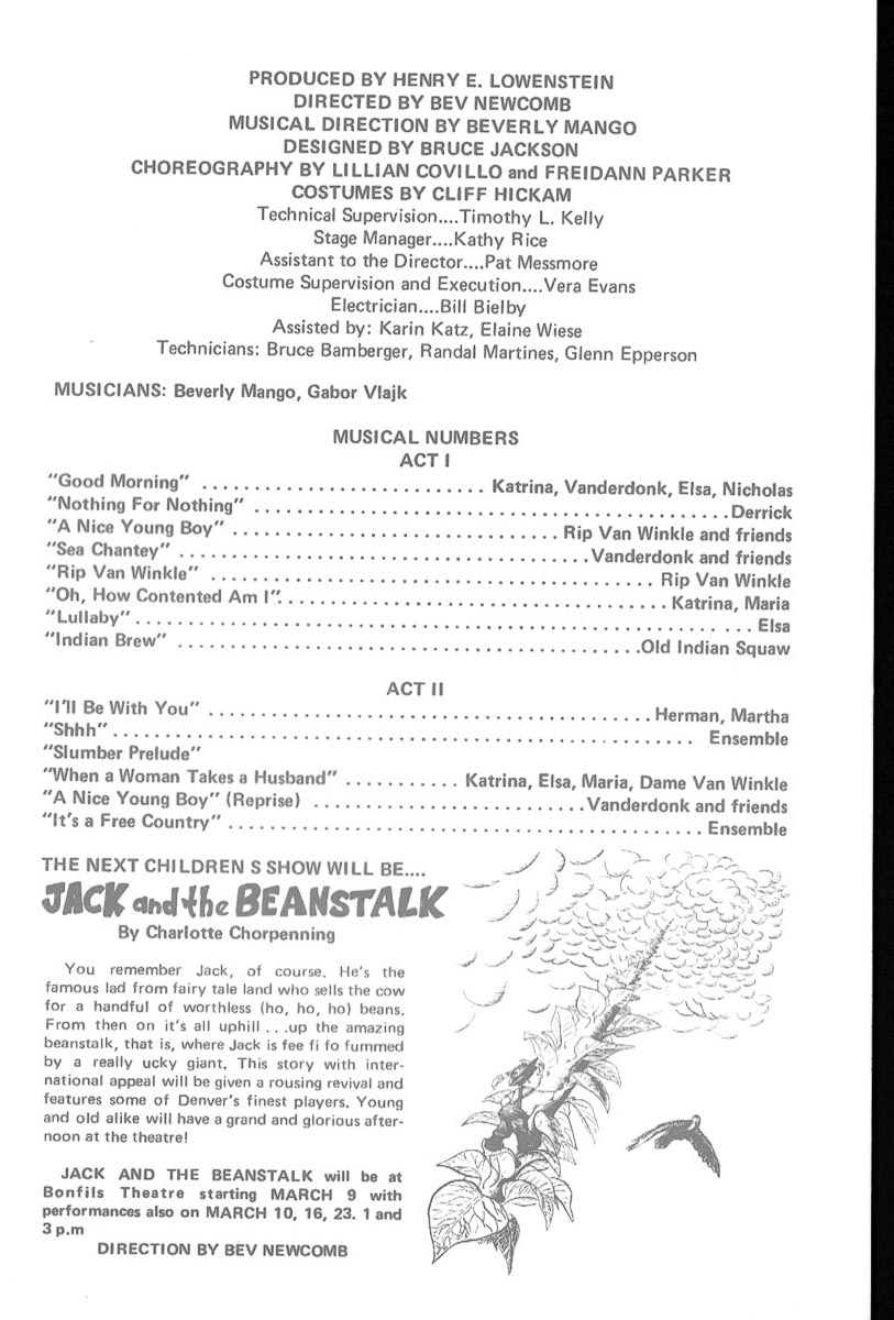 | 73-74 | Sat, Feb 09, 1974 | Rip Van Winkle | Bev Newcomb |