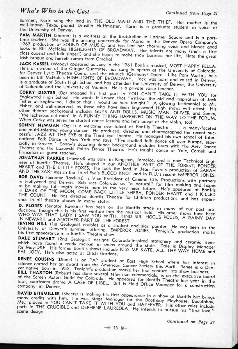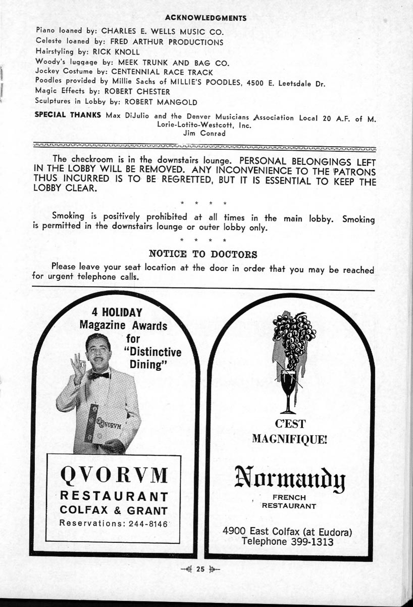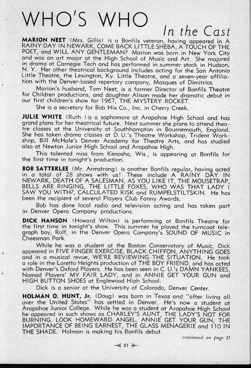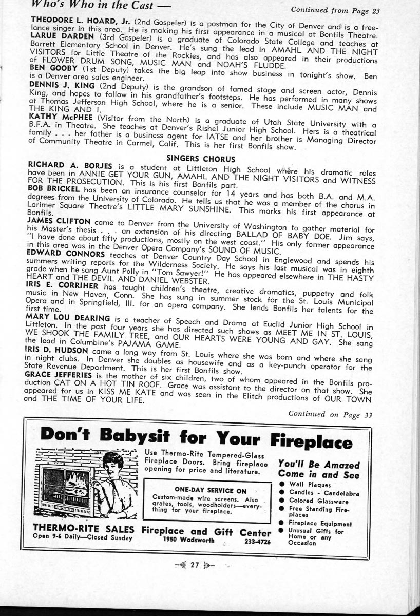 Many wonderful community performers donated their time to stand on a stage that was surrounded with professional staff who provided top-notch sets, props, costumes, lighting and sound. While not all shows were a smashing success, many were favorably reviewed and well attended. It was a unique platform for amateurs to hone their skills in the best possible environment. From the opening performance of “Green Grow the Lilacs” in 1953 to the closing of “A Christmas Carol” in 1985, there were 231 Main Stage productions.