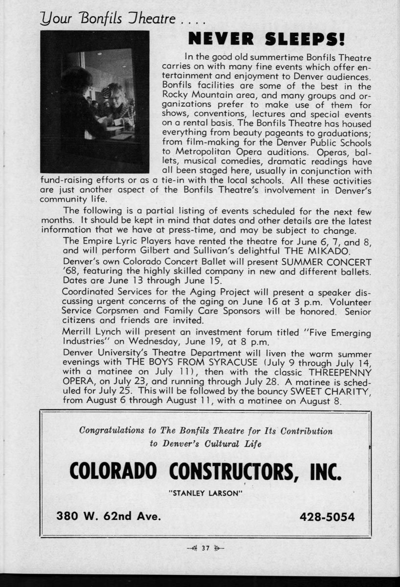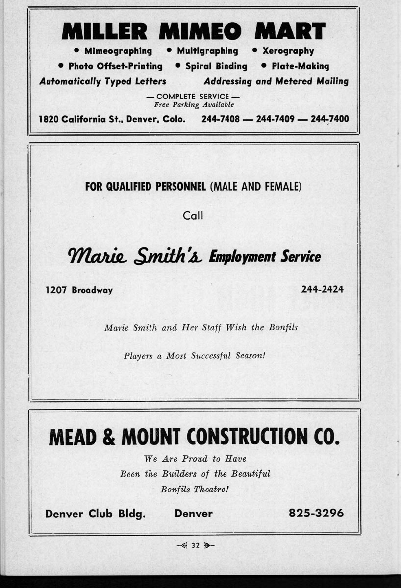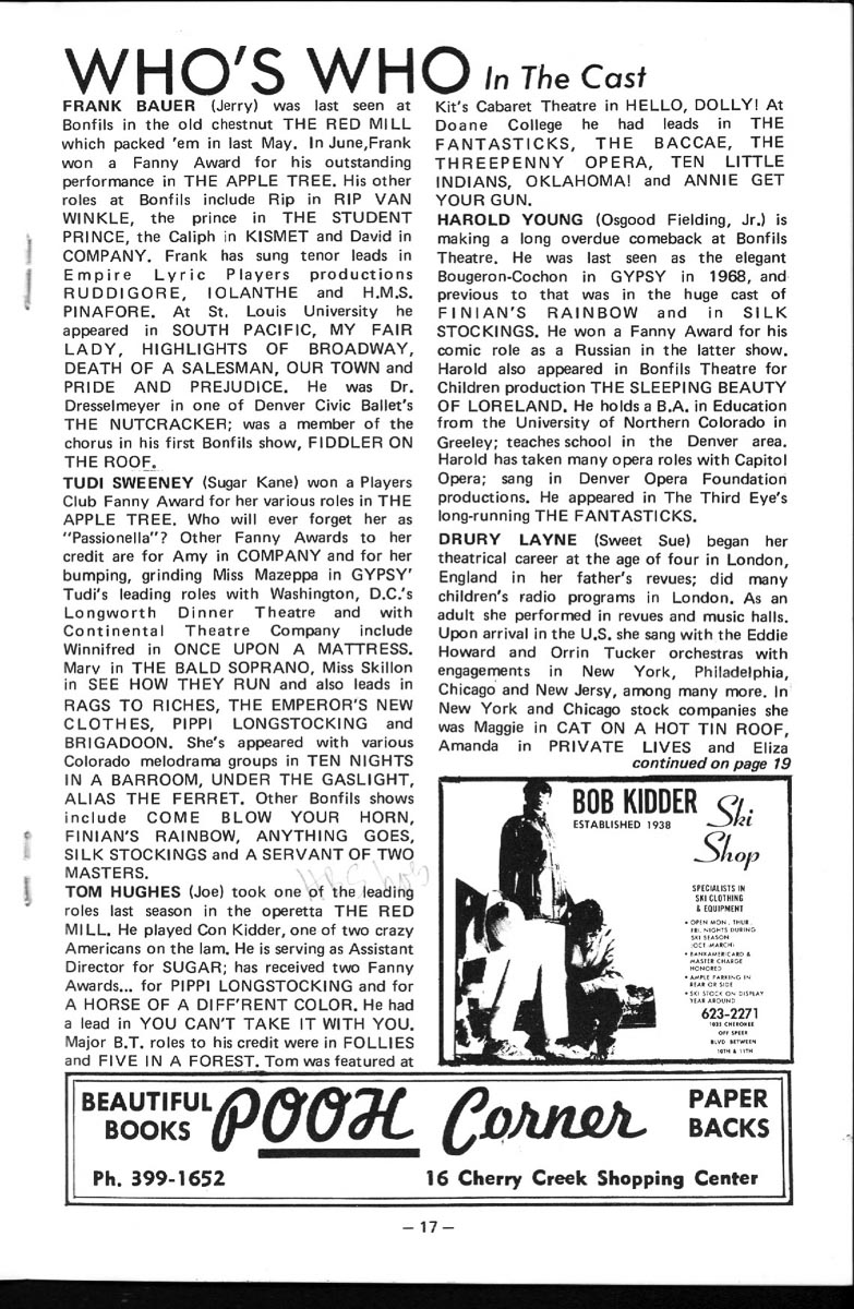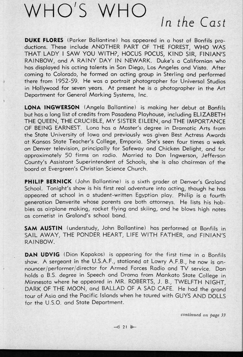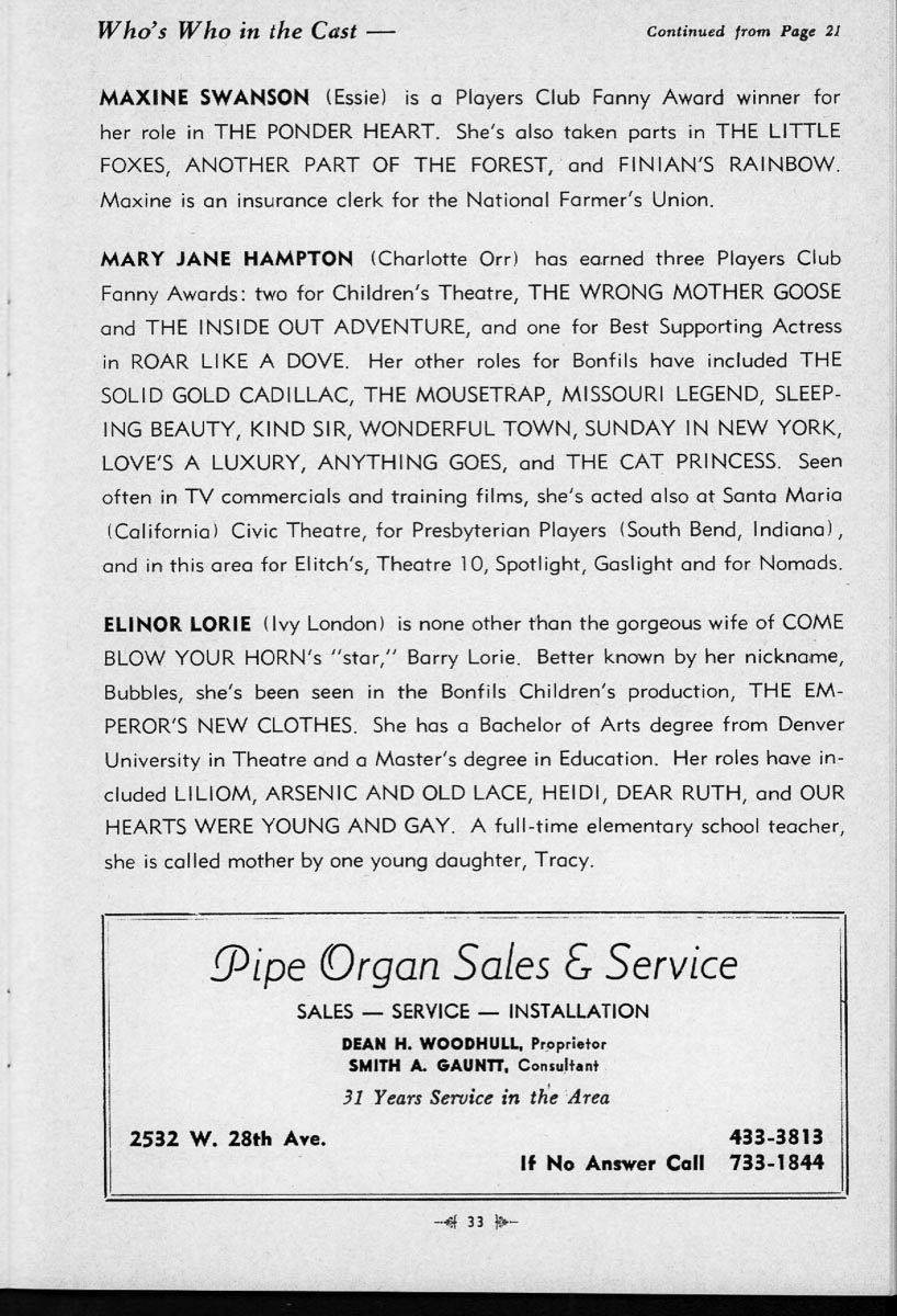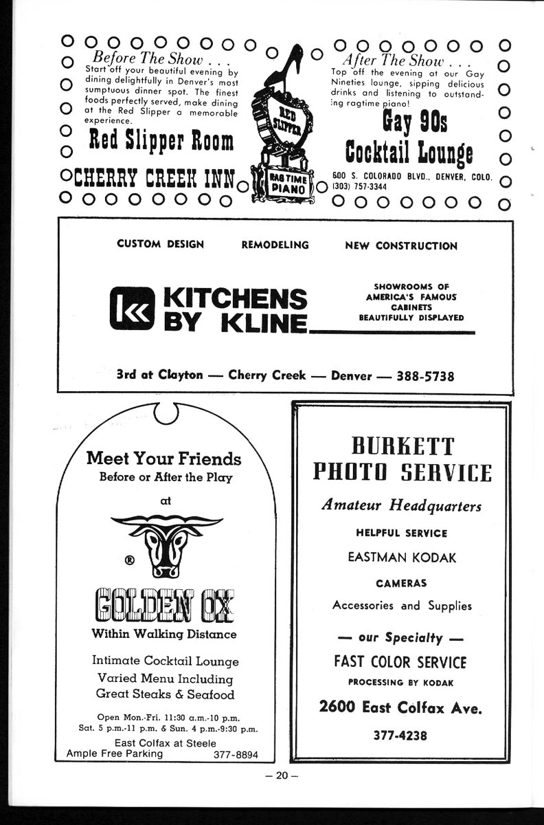 Many wonderful community performers donated their time to stand on a stage that was surrounded with professional staff who provided top-notch sets, props, costumes, lighting and sound. While not all shows were a smashing success, many were favorably reviewed and well attended. It was a unique platform for amateurs to hone their skills in the best possible environment. From the opening performance of “Green Grow the Lilacs” in 1953 to the closing of “A Christmas Carol” in 1985, there were 231 Main Stage productions.